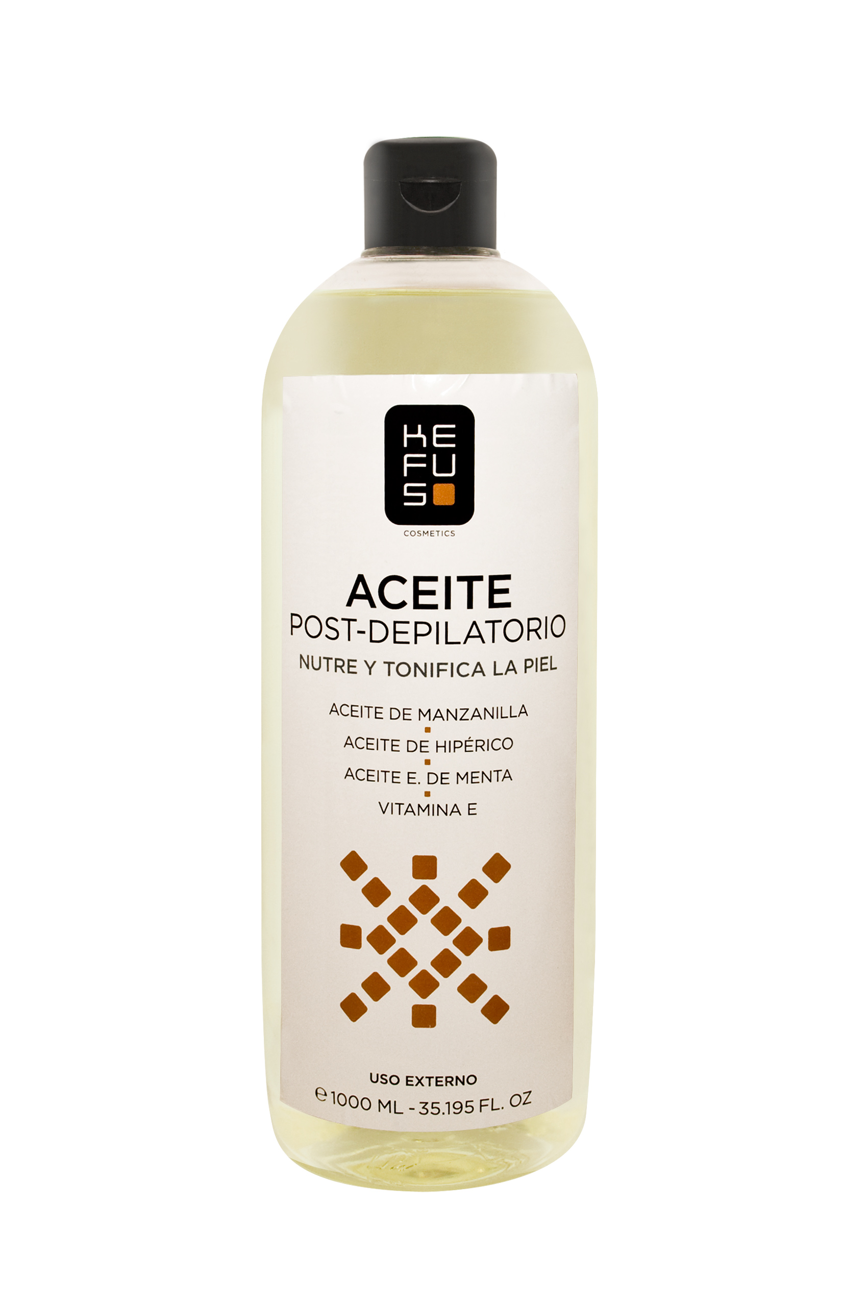 Aceite post depilatorio de Kefus, en formato de 1 litro, diseñado para calmar, hidratar y suavizar la piel después de la depilación, previniendo irritaciones y dejándola suave y nutrida.