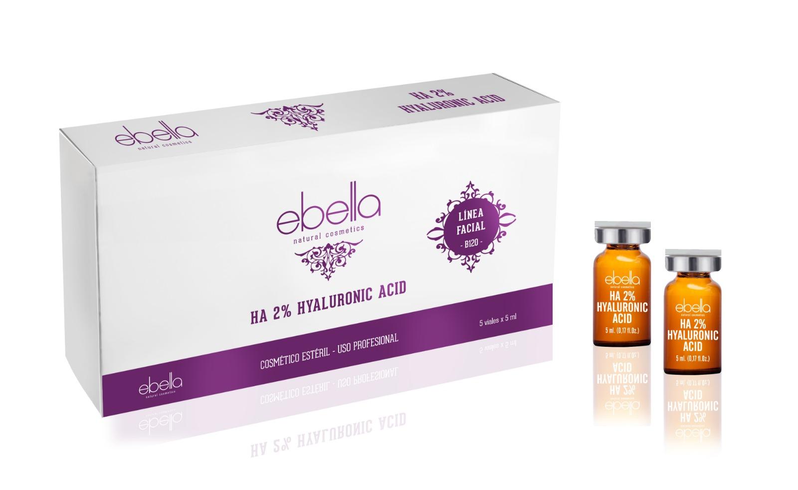 Ácido Hialurónico Ebella 2% – 5 viales x 5ml. Tratamiento facial con 2% de ácido hialurónico que hidrata profundamente, regenera y rejuvenece la piel. 5 viales de 5ml.