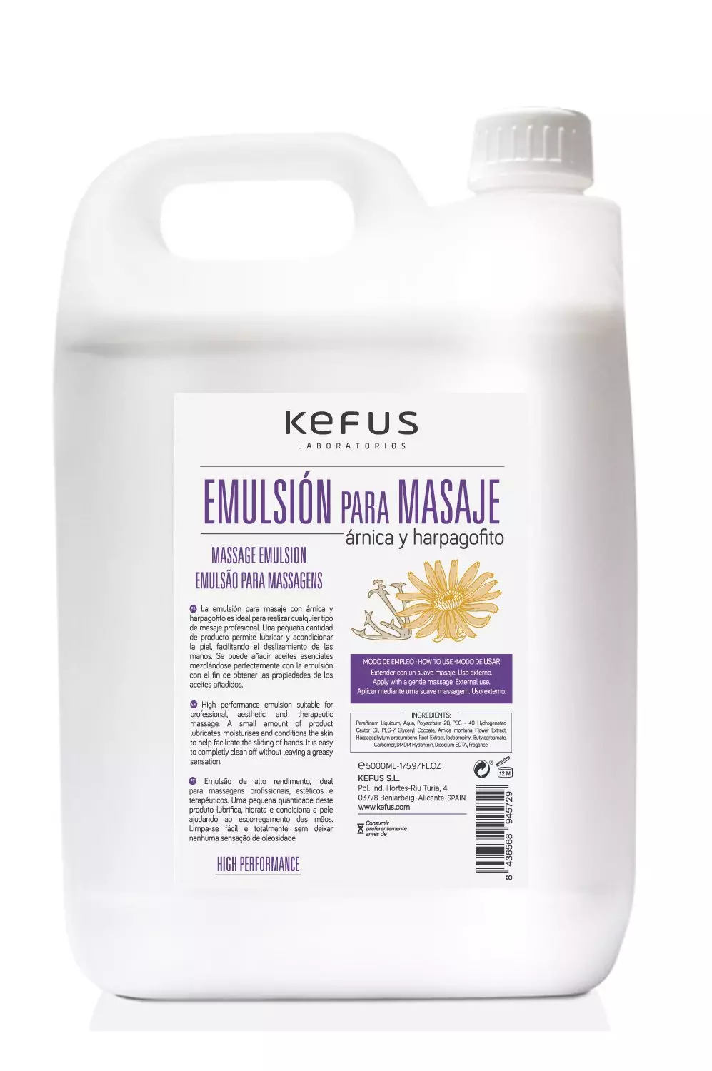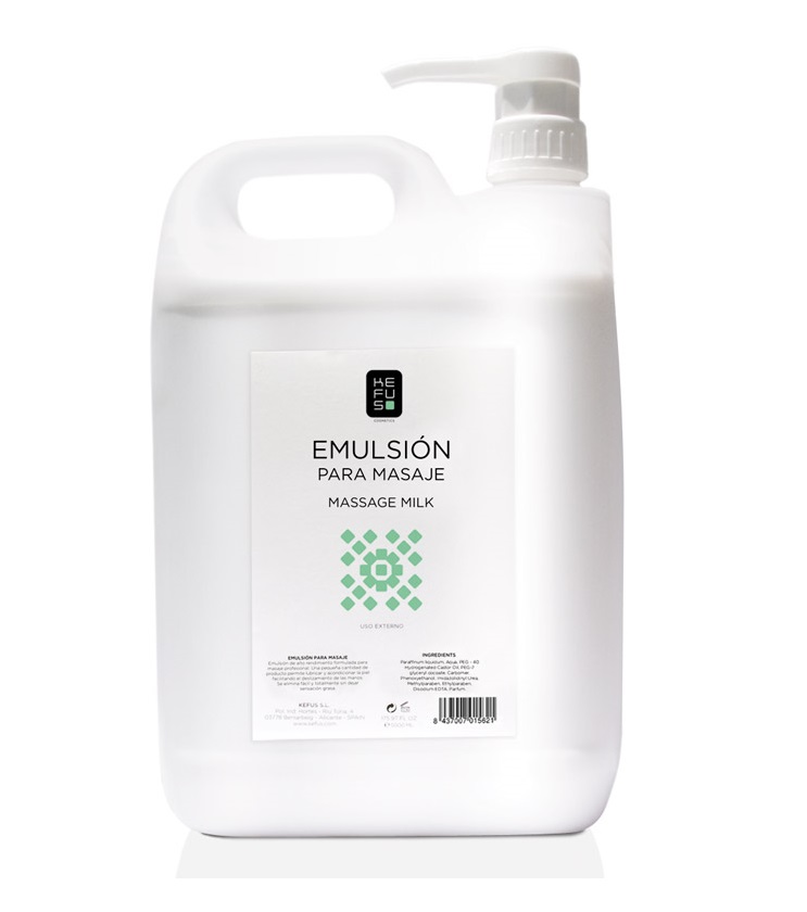 Emulsión para Masaje profesional Kefus de alto rendimiento. Una pequeña cantidad de producto permite lubricar y acondicionar la piel, facilitando el deslizamiento de las manos. Se elimina fácil y totalmente sin dejar sensación grasa.