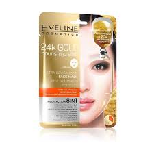 Mascarilla facial coreana con partículas de oro 24K. Revitaliza, ilumina y rejuvenece la piel al instante. Tratamiento de lujo con efecto inmediato. EVELINE Cosmetics.