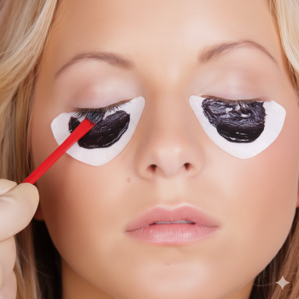 Colocar los parches debajo de las pestañas inferiores antes de aplicar el tinte. Utilizar una hoja de la libreta como superficie para mezclar el tinte y el revelador.