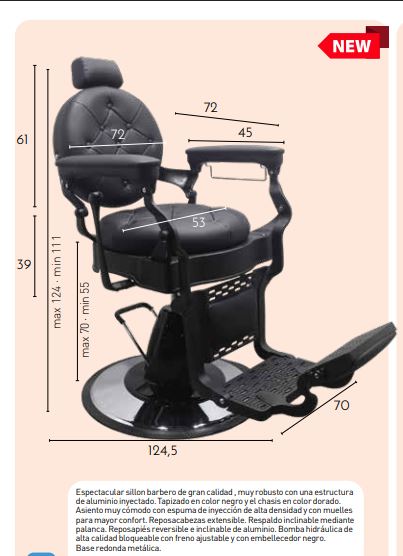 Este sillón destaca por su respaldo reclinable, reposacabezas ajustable y reposapiés extensible, lo que facilita los cortes de pelo, afeitados y tratamientos de barbería con la máxima precisión. Además, su base hidráulica permite regular la altura fácilmente, adaptándose a las necesidades de cada profesional.