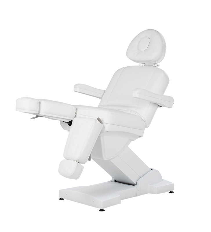 Sillón de pedicura profesional con 3 motores eléctricos, perneras independientes, respaldo reclinable y función camilla. Diseño robusto, tapizado en PU blanco, ideal para centros de estética y bienestar.
