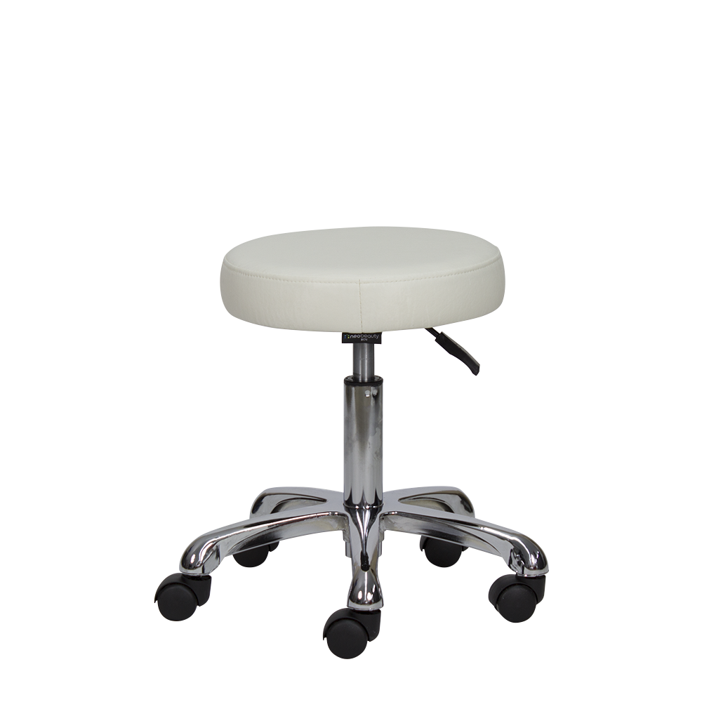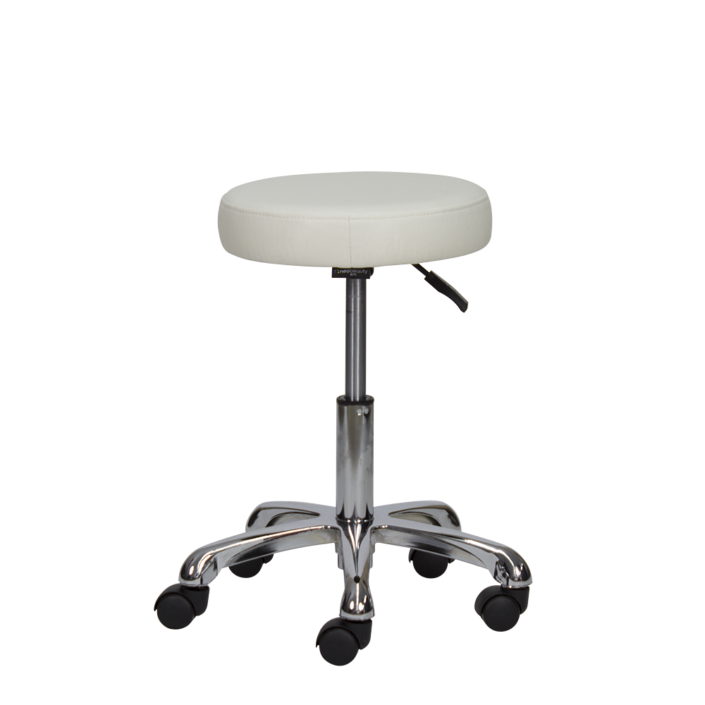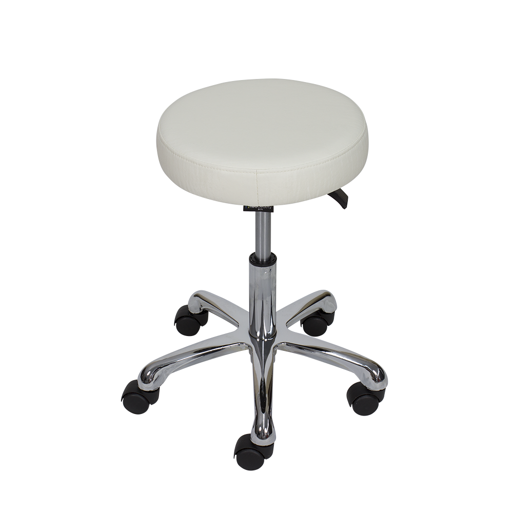Taburete redondo de 5 ruedas. Asiento tapizado en PVC de alta calidad, regulable en altura mediante pistón de gas.
