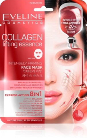 Mascarilla coreana facial con efecto lifting. Reafirma, hidrata y mejora la elasticidad de la piel gracias a su fórmula rica en colágeno. De EVELINE Cosmetics.