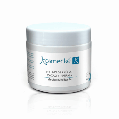 Peeling corporal de azúcar, cacao y naranja Kosmetiké Profesional 500 cc. Exfolia y nutre la piel, dejándola suave, hidratada y con un aroma delicioso de cacao y cítricos.