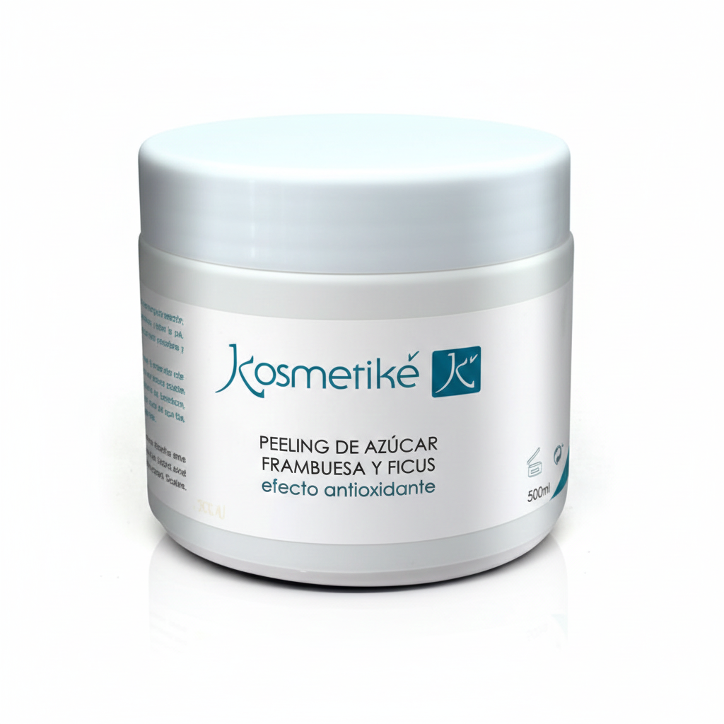Peeling corporal de azúcar, frambuesa y ficus Kosmetiké Profesional 500 cc. Exfolia, nutre y revitaliza la piel con un efecto antioxidante y reafirmante.